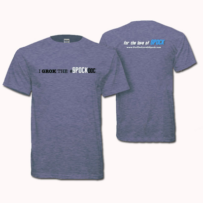 Adam Nimoy's Homage to his father Leonard Nimoy became a reality due to a successful kickstarter earlier in 2015. One of the kickstarter "swag" items was this I Grock The #SpockDoc t shirt. The shirt is a 50% cotton polyester blend in blue heather with "I Grok the #SpockDoc" and the "for the love of Spock" with the URL to the website on the reverse.